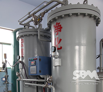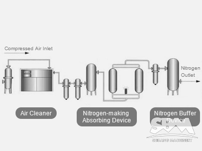 Firstly, air is compressed by air compressor. Then air enters the efficient oil remover where most oil, water and dust would be removed primarily. After that, the refrigerated-typed air-dryer removes most moisture and the powder filter removes the dust. Then the air enters the air storage tank. After buffer, the air is sent into the nitrogen making machine filled with absorbents. Clean compressed air enters to the adsorption tower from the bottom and then the air diffuses under the action of air diffuser. In the adsorption tower, the oxygen and nitrogen would be separated and the nitrogen would be sent to the tank for storage.