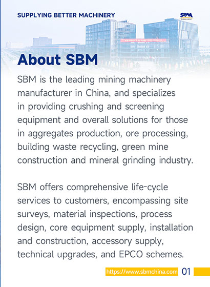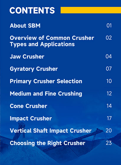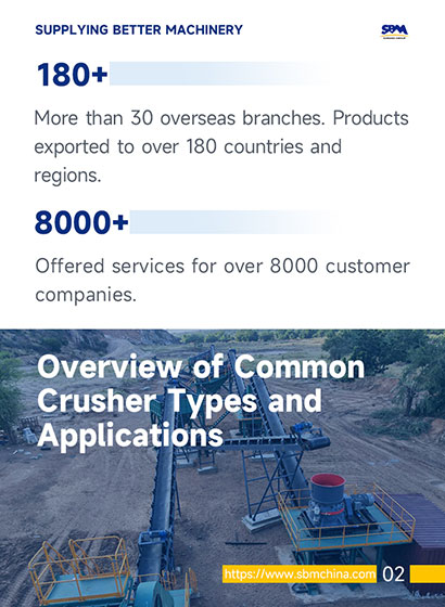 This comprehensive e-book provides an in-depth overview of SBM's five major types of crushing equipment: jaw crushers, gyratory crushers, cone crushers, impact crushers, and vertical shaft impact crushers. Jaw crushers and gyratory crushers are commonly utilized for coarse crushing tasks due to their robust design and ability to handle large rock sizes. In contrast, cone crushers and impact crushers are optimized for medium and fine crushing, providing precise material reduction suitable for various applications. The vertical shaft impact crusher is specifically designed for fine crushing and sand making, offering superior shaping capabilities and efficiency.