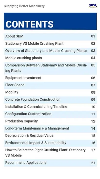 This E-book makes a comprehensive comparison between stationary and mobile crushing plant from several aspects, including equipment investment, floor space, mobility, concrete foundation construction, installation & commissioning timeline, configuration customization, and more.