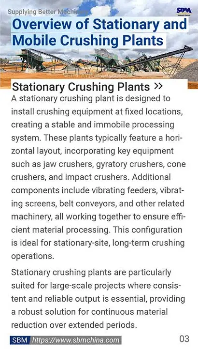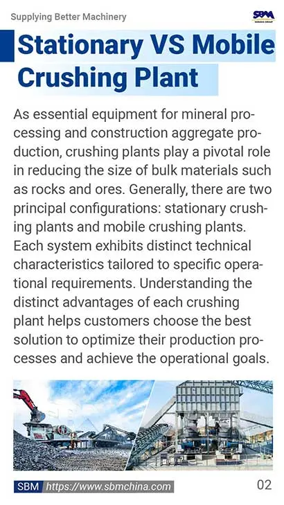 Stationary crushing plants and mobile crushing plants are two principal configurations of crushing plants. Each system exhibits distinct technical characteristics tailored to specific operational requirements. Understanding the distinct advantages of each crushing plant helps customers choose the best solution to optimize their production processes and achieve the operational goals.