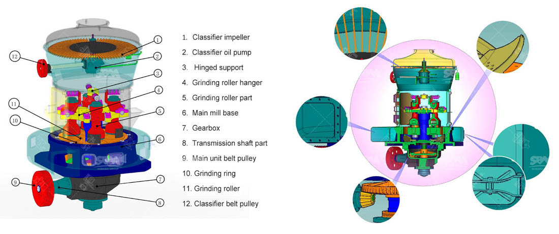 The grinding device: a device equipped with professional grinding rollers and grinding rings. The grinding process is mainly completed in the grinding device; the crushed fine powder is going with the grading airflow and reasonably graded by the classifier.